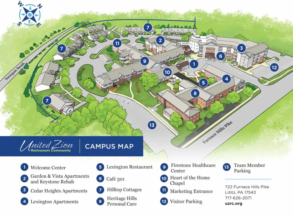 Discover United Zion Retirement Community’s beautiful Lititz campus — where independent living, personal care, and healthcare services all come together in one welcoming neighborhood. Our thoughtfully designed community includes spacious apartments, cozy cottages, and inviting common spaces for dining, wellness, and connection.